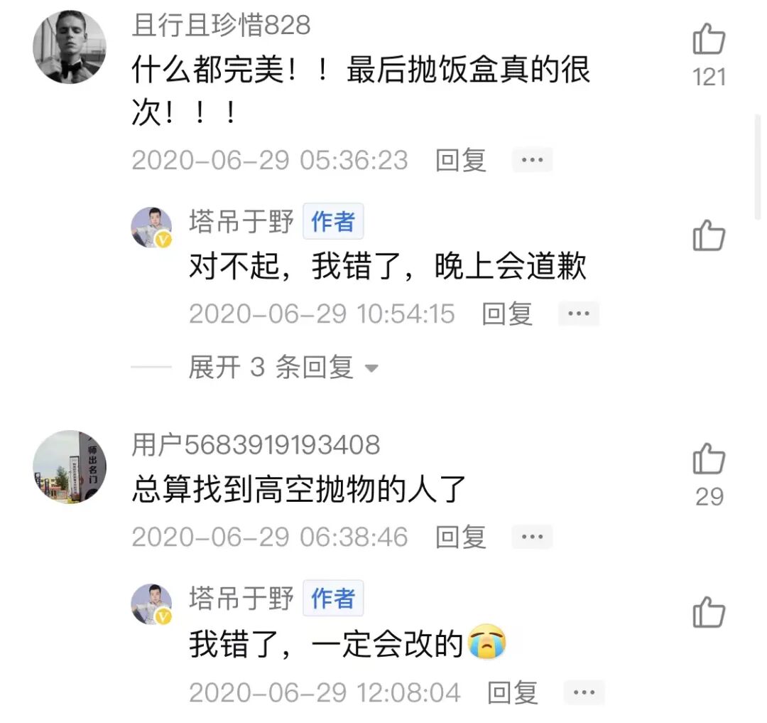 拍了一个多月就出了个160万播放量的作品,但评论却全是骂他的。视频里,他把吃完的盒饭直接从塔吊上扔了下去。意识到做了错事的于野逐一回复并致歉,随后又专门发了道歉视频。