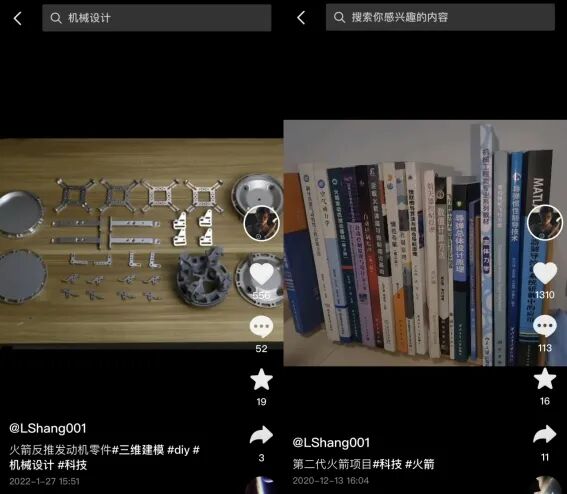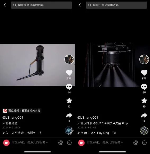 目前,刘上的抖音和西瓜视频号@ LShang001 更新了137个作品,大部分和火箭制作有关。