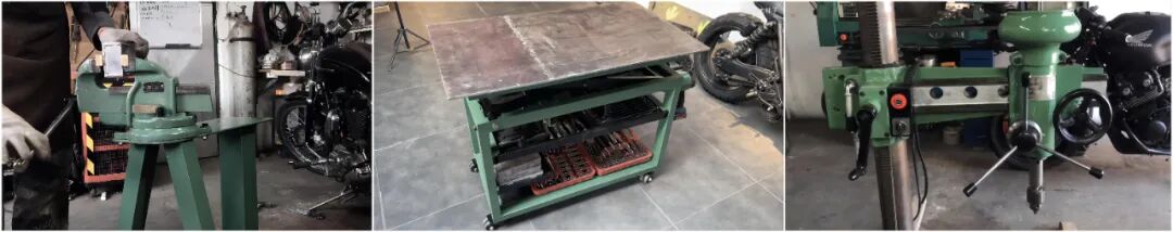 1976年生产的摇臂钻,时隔46年虽然外表狼狈但内心依旧强健,修复后用来给钢材打孔。1971年出厂的台虎钳,收购价只要9毛一斤,拆解清洗修复后用来稳定夹持工件。车库里带翻转机构的维修支架、喷砂机、重型多功能升降工作台,也都是大林子的成果。