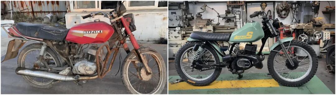 “焊工大林子”是一名机车发烧友,喜欢改装从废品收购站淘来的老机车,被粉丝们誉为“业余机车维修界天花板”。图中的铃木AX100机车,是他按2元一斤的价格花400块淘来的,看改装后的效果,身价翻几十倍不过分吧?