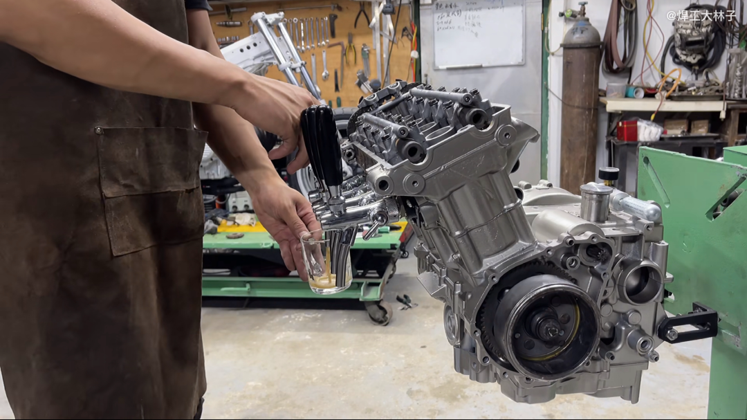 掏空报废的川崎发动机,装上导管和小气瓶,改装成可乐机,方便在修车时随时来一杯快乐水。