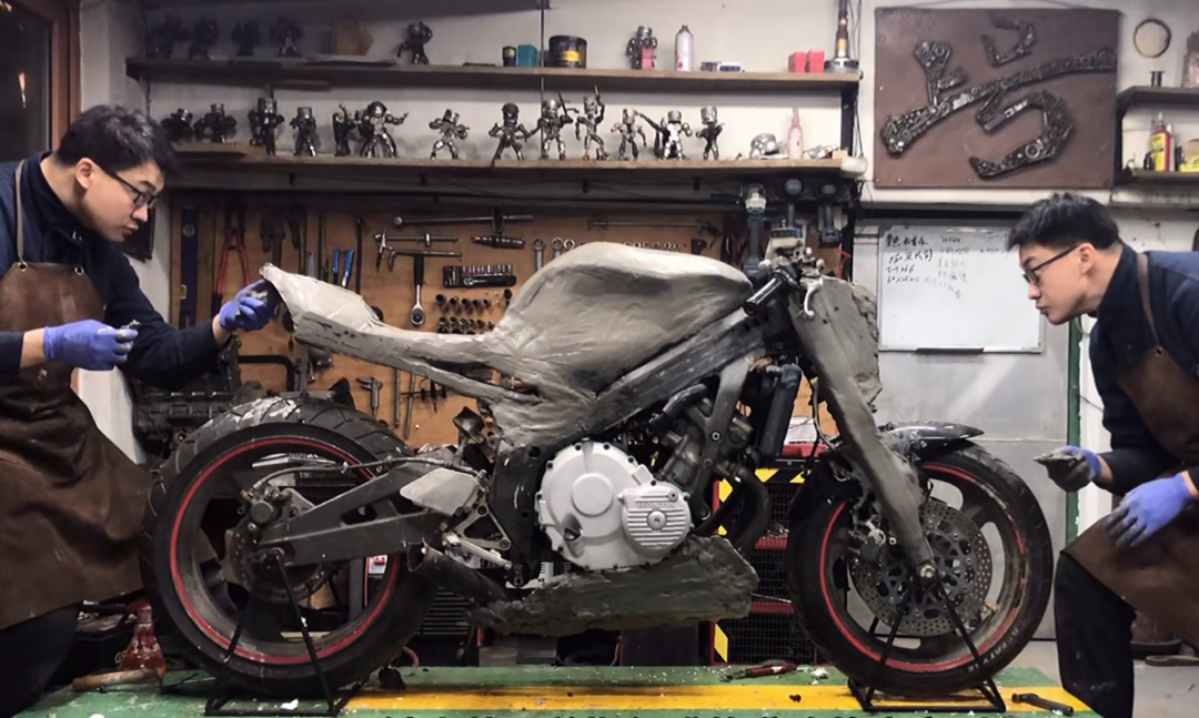 专业的改装师傅通常会先画出设计图,大林子则另辟蹊径,用雕塑泥糊在机车上塑形,直到完美呈现对设计的想法——“尖尖的尾巴棱角分明,前倾的车头贴地滑行”。