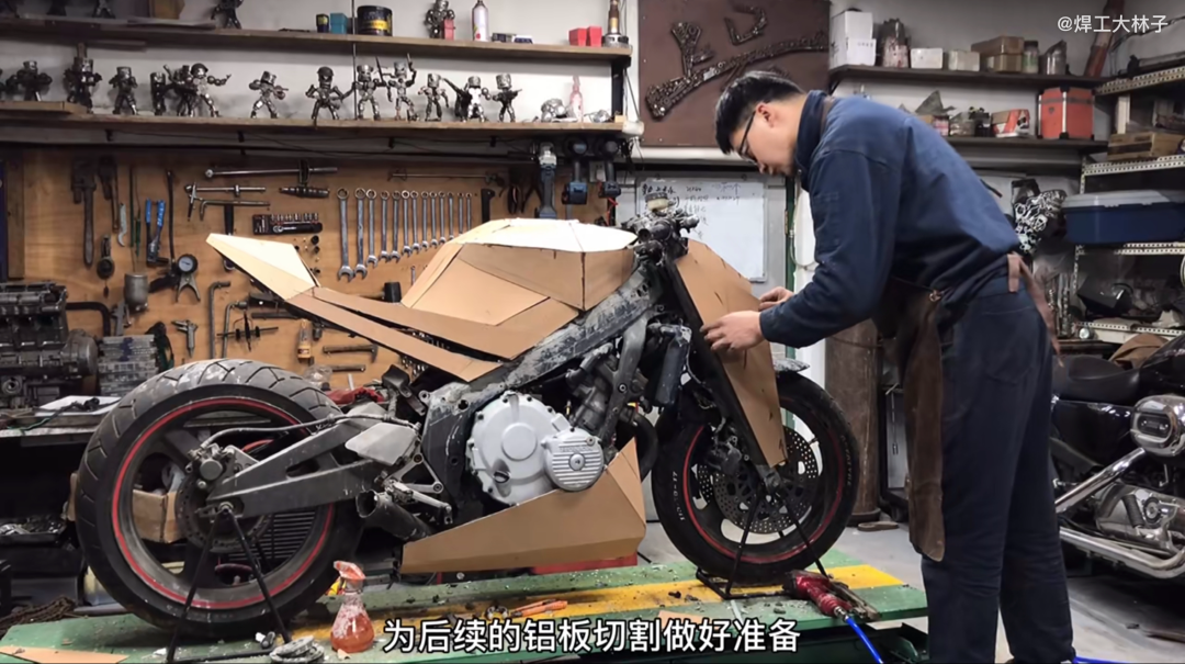 塑形后的机车看起来十分“毛坯”,还需要一番精装修。大林子计划为它制作一套棱角分明的太空铝材外壳。裁剪好的纸壳模拟铝材切面,贴合泥塑造型的曲线,演化出具体数值。据大林子说,这是“国际改车通用的纸壳疗法”。根据切面数值切割好铝板,替换纸壳固定在车身上,大林子仔细焊接好每一个缝隙,并进行焊道抛光。