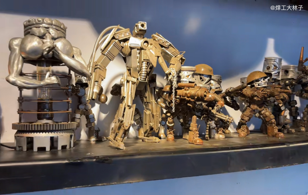在小车库的搁板上,摆放着一排用废旧零件做成的形态各异的模型。大林子把它们命名为“梦想军团”。他兴致勃勃地说,等到“梦想军团”的创作全部完成,计划申请一项吉尼斯世界纪录。或许这就是他在视频中提到的,要做更多关于机车更有意义的事。