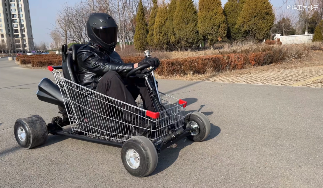 把超市购物车改装成“四驱车”,各大商场都不允许进入,园区里兜一圈也很拉风。