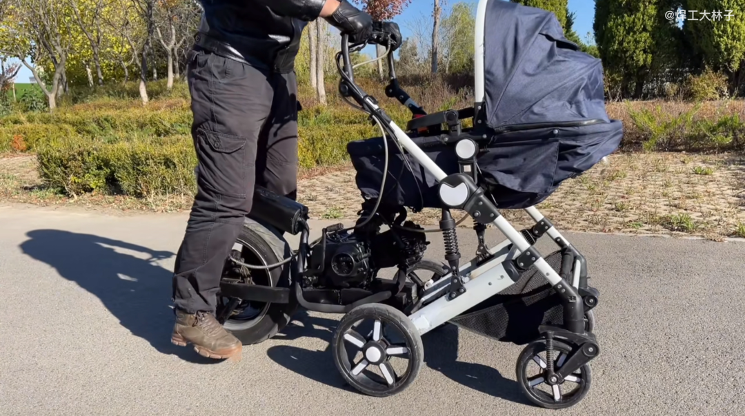 他想让婴儿从小就能体会到飙车的刺激,把125排量的发动机安装到婴儿车上,亲自带娃飙车。网友开玩笑:好是好就是有点费孩子。