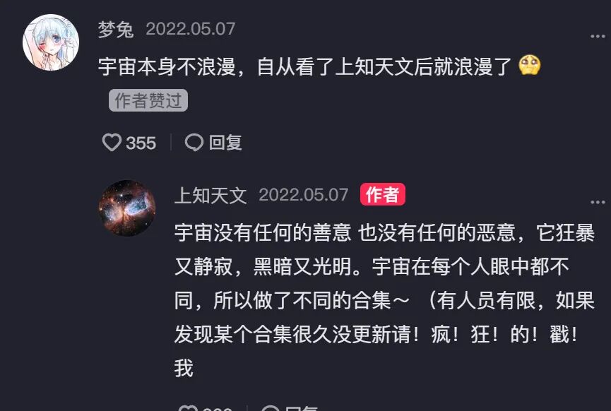 一位粉丝留言:“宇宙本来不浪漫,自从看了上知天文后就浪漫了。”