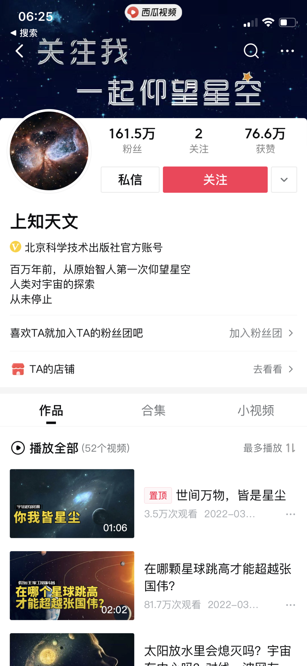 这就是北京科学技术出版社@上知天文,他们在抖音和西瓜视频上用科普视频建设了一个线上天文馆,超过160万人在这里看星星,看月亮,探索银河系的奇迹。