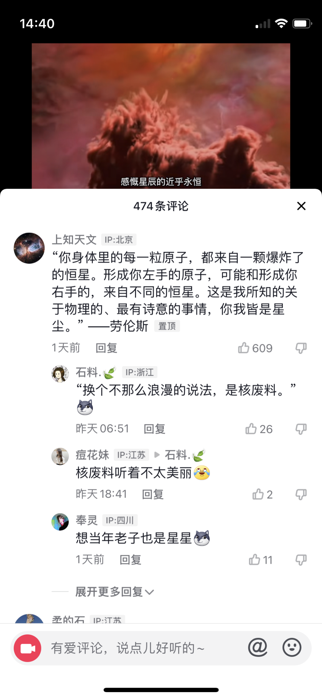 而@上知天文 更喜欢把每个人称为“星辰的孩子”。在评论区,它引用物理学家劳伦斯·克劳斯的话——