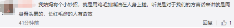网友:我姑妈有个小妙招,就是用鸡毛加煤油在人身上搓,听说对于我们方言讲的周身骨头累的,长红毛痧的人有奇效。
