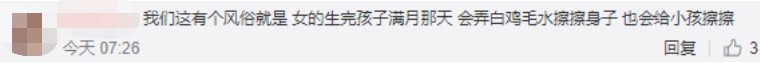 网友:我们这有个风俗就是,女的生完孩子满月那天,会弄白鸡毛水擦擦身子,也会给小孩擦擦。