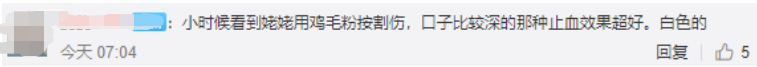 网友:小时候看到姥姥用鸡毛粉按割伤,口子比较深的那种,止血效果超好。白色的。