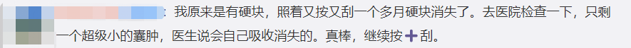 网友:我原来是有硬块,照着又按又刮一个多月硬块消失了。去医院检查一下,只剩一个超级小的囊肿,医生说会自己吸收消失的。真棒,继续按➕刮。