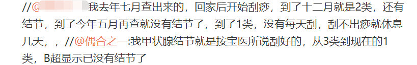 网友B:我甲状腺结节就是按宝医所说刮好的,从3类到现在的1类,B超显示已没有结节了。