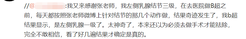 网友:我又来感谢张老师,我左侧乳腺结节三级,在去医院做B超之前,每天都按照张老师微博上针对结节的那几个动作做,结果奇迹发生了,我b超结果显示,是左侧乳腺一级了。太神奇了,本来还以为必须去做手术才能祛除,完全不敢相信,看了好几遍结果才确定是真的。