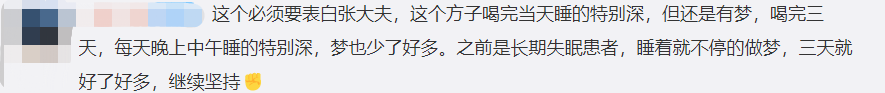 网友:这个必须要表白张大夫,这个方子喝完当天睡的特别深,但还是有梦,喝完三天,每天晚上中午睡的特别深,梦也少了好多。之前是长期失眠患者,睡着就不停的做梦,三天就好了好多,继续坚持。