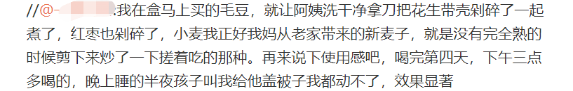网友:我在盒马上买的毛豆,就让阿姨洗干净拿刀把花生带壳剁碎了一起煮了,红枣也剁碎了,小麦我正好我妈从老家带来的新麦子,就是没有完全熟的时候剪下来炒了一下搓着吃的那种。再来说下使用感吧,喝完第四天,下午三点多喝的,晚上睡的半夜孩子叫我给他盖被子我都动不了,效果显著。
