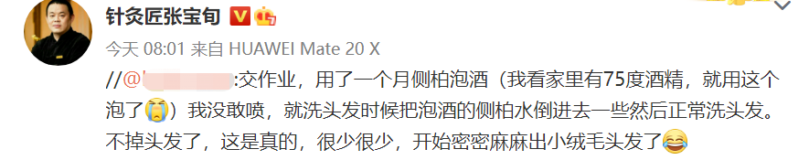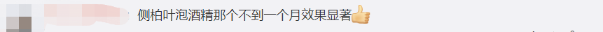 网友:交作业,用了一个月侧柏泡酒(我看家里有75度酒精,就用这个泡了)我没敢喷,就洗头发时候把泡酒的侧柏水倒进去一些然后正常洗头发。不掉头发了,这是真的,很少很少,开始密密麻麻出小绒毛头发了。
