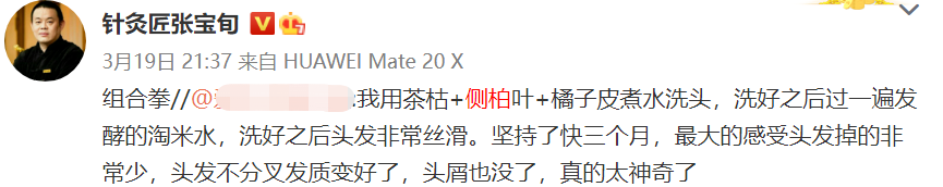 网友:我用茶枯+侧柏叶+橘子皮煮水洗头,洗好之后过一遍发酵的淘米水,洗好之后头发非常丝滑。坚持了快三个月,最大的感受头发掉的非常少,头发不分叉发质变好了,头屑也没了,真的太神奇了。