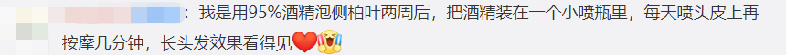 网友:我是用95%酒精泡侧柏叶两周后,把酒精装在一个小喷瓶里,每天喷头皮上再按摩几分钟,长头发效果看得见。