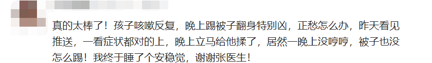 网友:真的太棒了!孩子咳嗽反复,晚上踢被子翻身特别凶,正愁怎么办,昨天看见推送,一看症状都对的上,晚上立马给他揉了,居然一晚上没哼哼,被子也没怎么踢!我终于睡了个安稳觉,谢谢张医生!