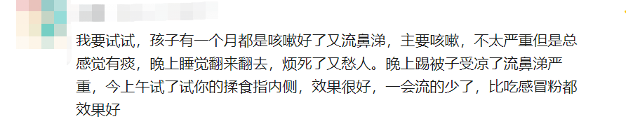 网友:我要试试,孩子有一个月都是咳嗽好了又流鼻涕,主要咳嗽,不太严重但是总感觉有痰,晚上睡觉翻来翻去,烦死了又愁人。晚上踢被子受凉了流鼻涕严重,今上午试了试你的揉食指内侧,效果很好,一会流的少了,比吃感冒粉都效果好。