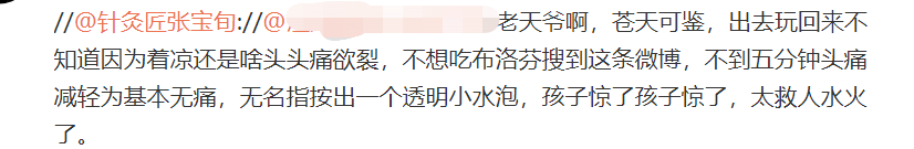 网友:老天爷啊,苍天可鉴,出去玩回来不知道因为着凉还是啥头头痛欲裂,不想吃布洛芬搜到这条微博,不到五分钟头痛减轻为基本无痛,无名指按出一个透明小水泡,孩子惊了孩子惊了,太救人水火了。