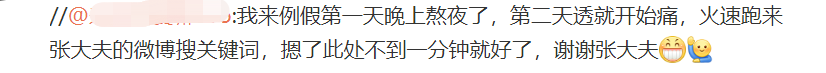 网友:我来例假第一天晚上熬夜了,第二天透就开始痛,火速跑来张大夫的微博搜关键词,摁了此处不到一分钟就好了,谢谢张大夫。