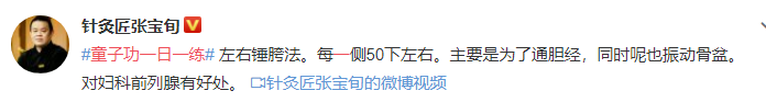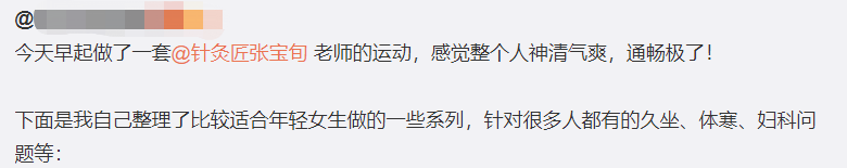 网友:今天早起做了一套@针灸匠张宝旬 老师的运动,感觉整个人神清气爽,通畅极了!下面是我自己整理了比较适合年轻女生做的一些系列,针对很多人都有的久坐、体寒、妇科问题等。
