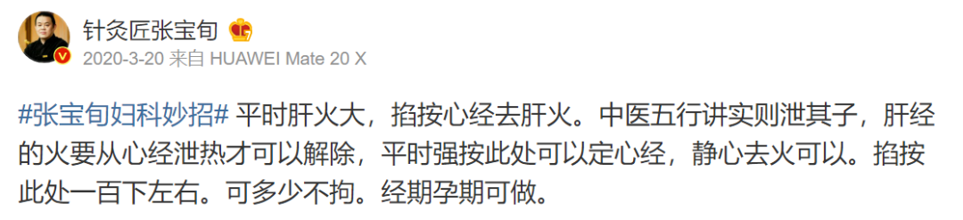 张老师:平时肝火大,掐按心经去肝火。中医五行讲实则泄其子,肝经的火要从心经泄热才可以解除,平时强按此处可以定心经,静心去火可以。掐按此处一百下左右。可多少不拘。经期孕期可做。