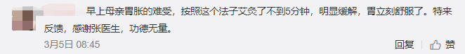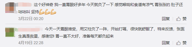 网友:这个好神奇,我一直胃酸好多年,今天就灸了一下,感觉喉咙和食道有凉气,胃涨涨的,肚子还咕咕叫,坚持。