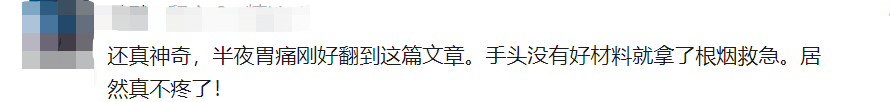 网友:还真神奇,半夜胃痛刚好翻到这篇文章。手头没有好材料就拿了根烟救急。居然还真不疼了!