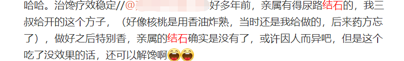 网友:好多年前,亲属有得尿路结石的,我三叔给开的这个方子,(好像核桃是用香油炸熟,当时还是我给做的,后来药方忘了),做好之后特别香,亲属的结石确实是没有了,或许因人而异吧,但是这个吃了没效果的话,还可以解馋啊。