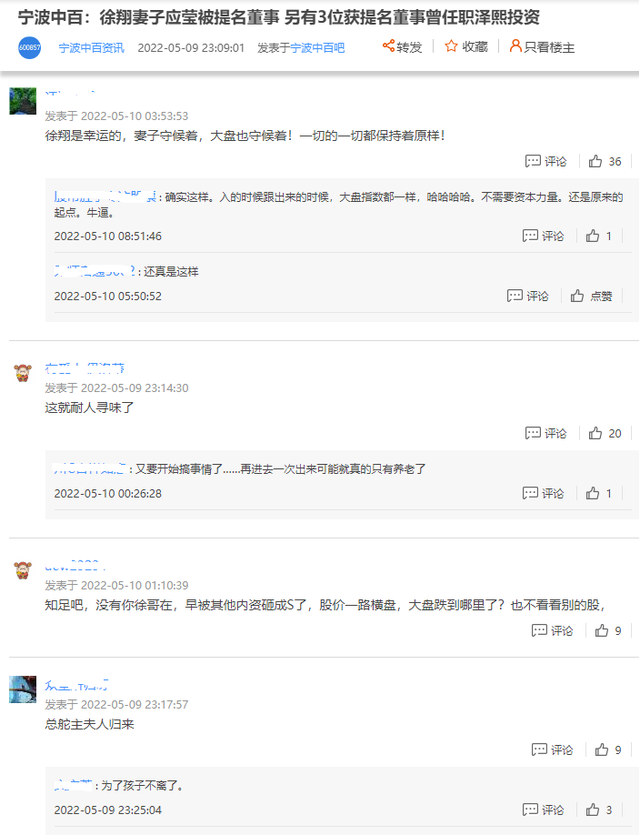 在宁波中百股吧里,关于“应莹提名董事”的消息评论有近百条,有人表示,“这就耐人寻味了。”