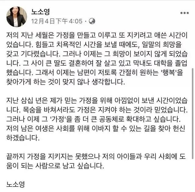 “在过去的30年里,我一直为了守护家庭而拼尽全力,即使受累受辱,也都怀有一丝希望。但现在已经看不到任何希望。在这期间,孩子们也都长大成人,生活得很好。所以,我认为是时候让丈夫去寻求他渴望的‘幸福’了。”