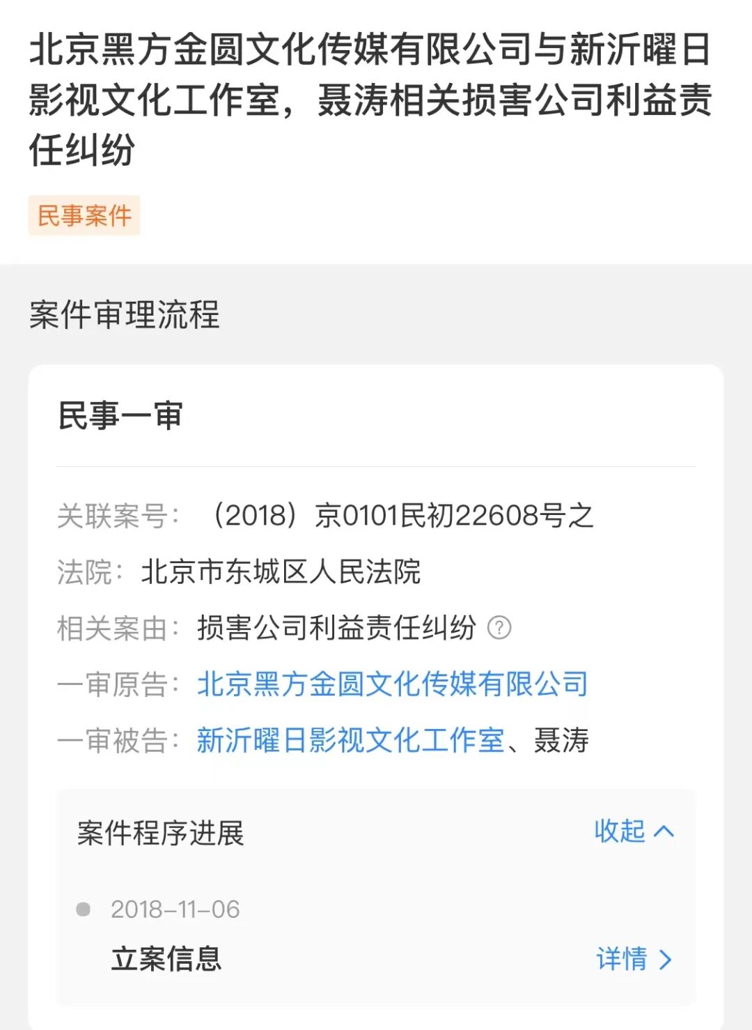 中国裁判文书网披露的相关诉讼文件显示,2018年10月,时任黑金经纪监事代表尚雯婕向一审法院对该公司时任董事长、法定代表人聂涛及其独资成立的新沂曜日影视文化工作室(简称“曜日工作室”)提起损害公司利益责任纠纷诉讼。同年11月,法院正式立案。