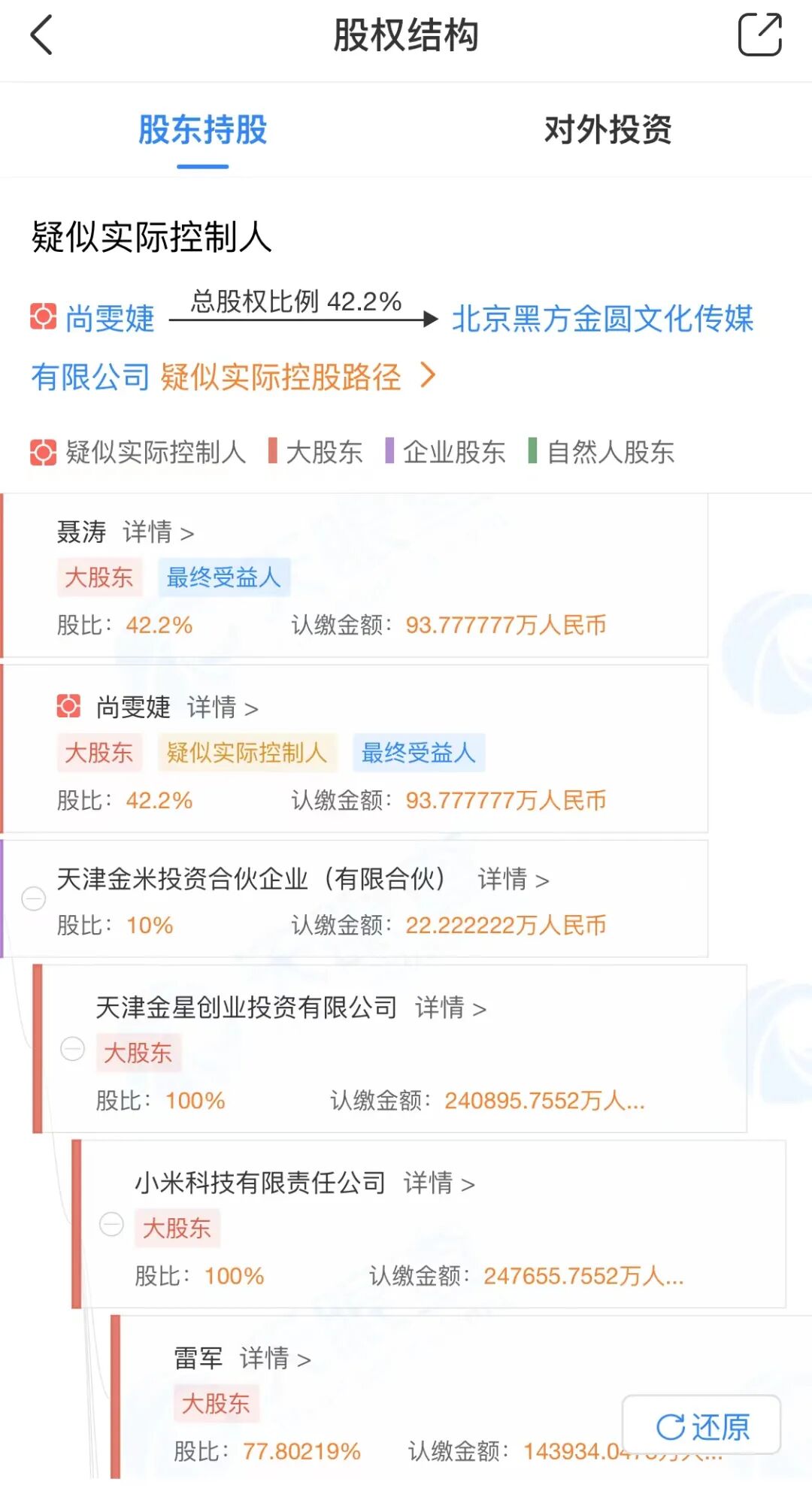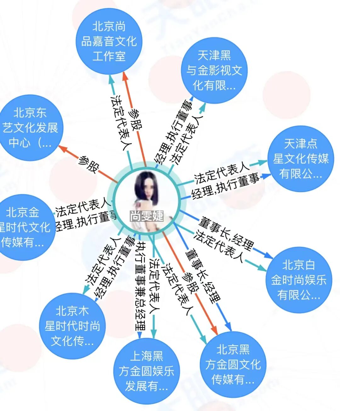 2014年4月,尚雯婕与聂涛合资注册成立北京黑方金圆文化传媒有限公司(简称“黑金经纪”)。另据天眼查,尚雯婕还实际控制北京尚品嘉音文化工作室、北京木星时代时尚文化传播有限公司(简称“木星时代”)、北京白金时尚娱乐有限公司、北京点星文化传媒有限公司等公司。