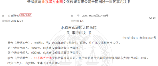 不过,就2021年12月发布的一审判决来看,法院支持曾舜晞的请求,确认其与黑金经纪的艺人合约于2021年2月18日解除,并判决黑金经纪向其支付收益分成款1500万元。