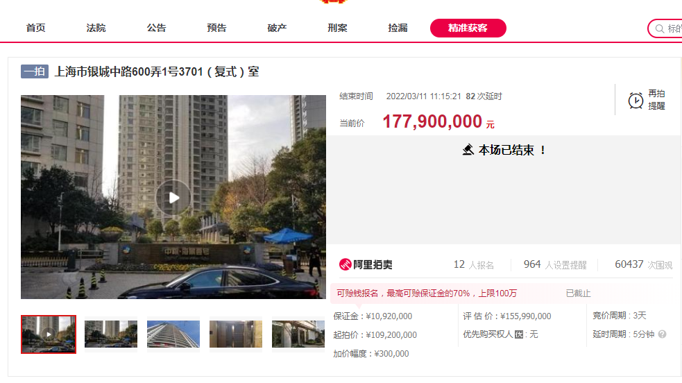 根据法院给的法拍公告,这套豪宅起拍价只有1.092亿,也就是说最终成交价格溢价率达到63%。