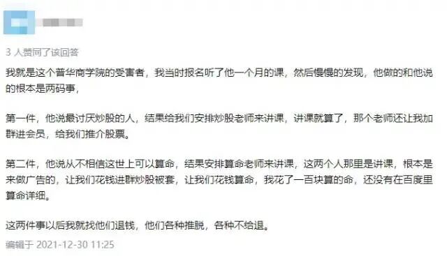 知乎上有网友介绍,他在普华商学院听了一个月的课,与翟山鹰承诺的课程千差之别。课堂上安排炒股老师讲课,要求学员加群,给推荐股票,更奇葩的是开设算命课,算命结果甚至不如百度搜索出来的资料详细。