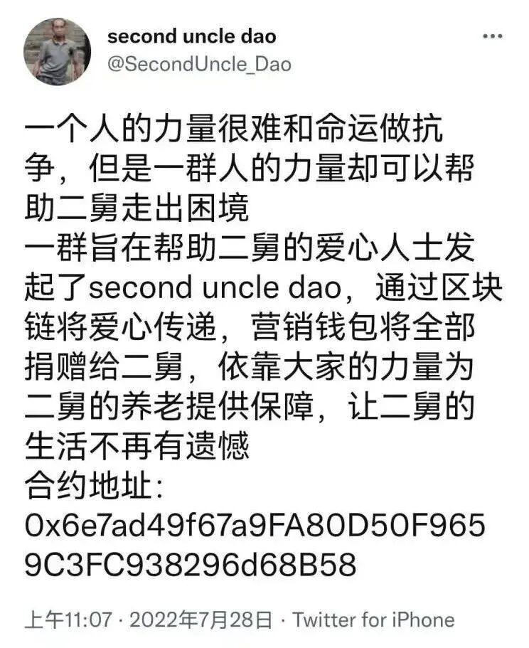 另外有人借“二舅”开始发币了。7月28日起,推特账号“second uncle dao”开始蹭热度,兜售自创的“二舅币”,还打着“钱全部捐赠给二舅”的旗号。