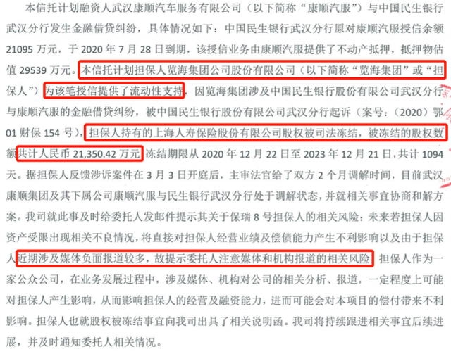 另外,览海控股还多次为福日汽车、康顺汽车信托融资提供担保18亿,综合来看览海共计为汽车相关企业提供66亿元的担保。