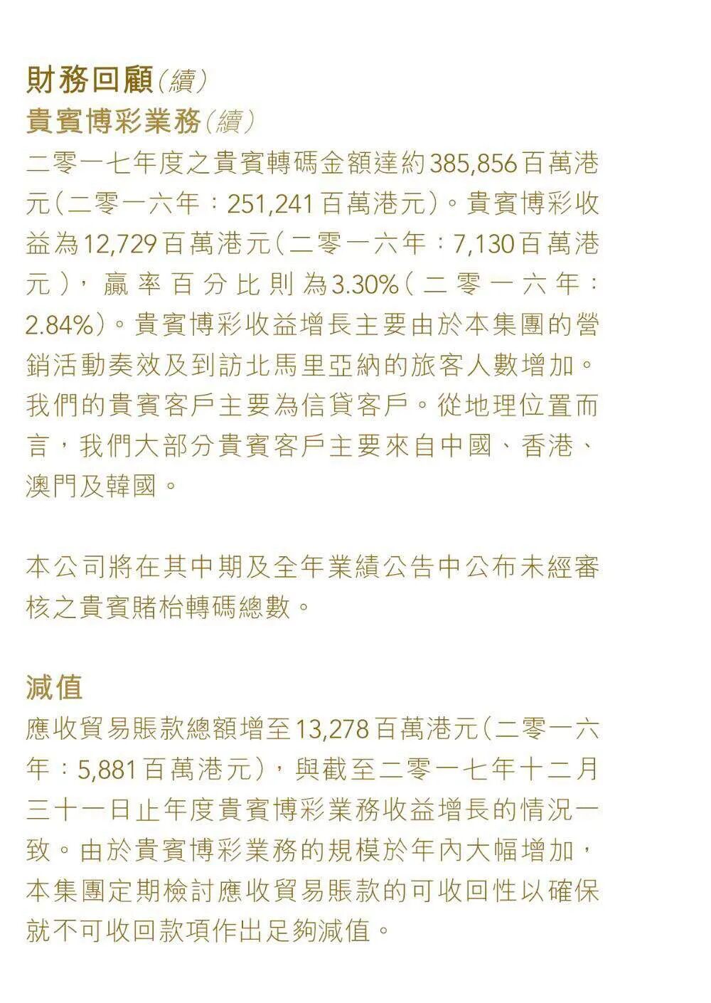 那年财报显示,2017年全年营收131.6亿港元,其中96.7%来自贵宾柜台,全年“贵宾赌台转码数”达到3858亿港元(495亿美元),也就是经手的赌额。