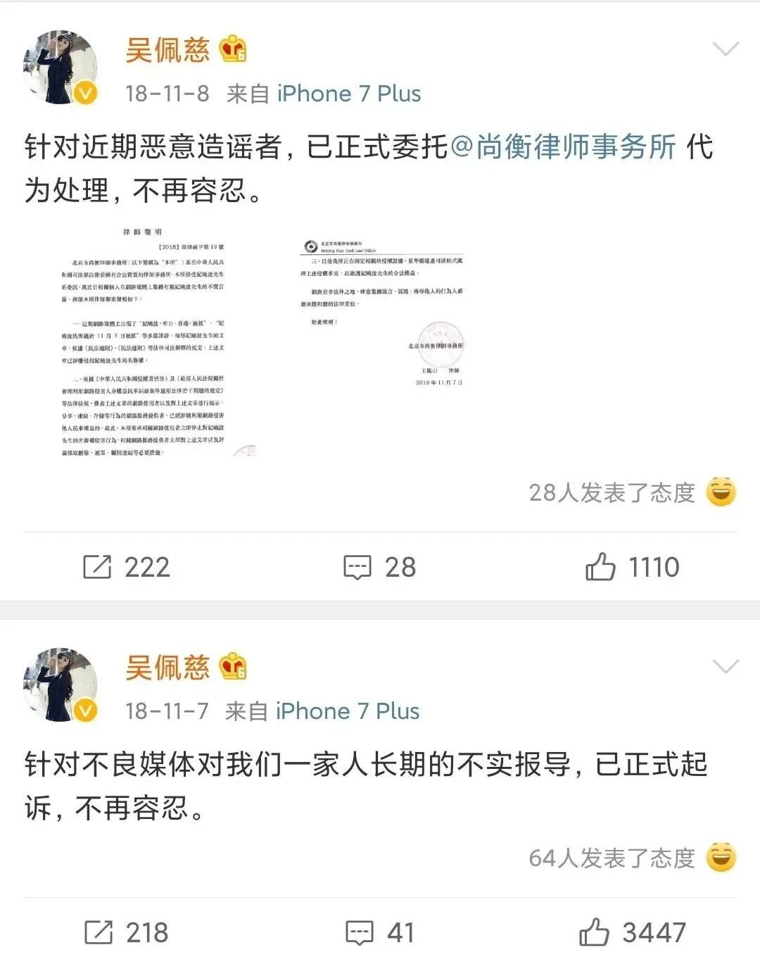 还是吴佩慈在微博发声,晒出律师函,表示起诉造谣者: