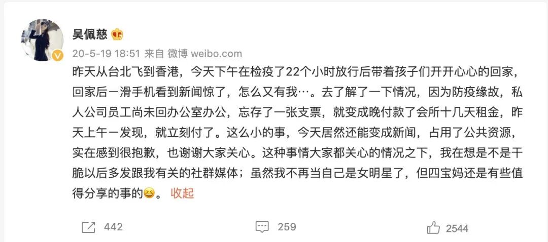 催债的消息曝光后,迅速冲上热搜,关于纪晓波没钱了的传言再次甚嚣尘上,吴佩慈只好出面解释,因私人公司员工因疫情未能返回办公,忘存支票,发现后已立刻交租。
