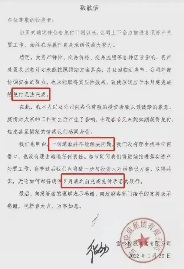 1月30日,雪松信托发布了一封道歉信,落款有张劲的签名。信中言明了“无法完成兑付”,表示“一句道歉并不能解决问题”,并承诺“2月底之前完成兑付”。