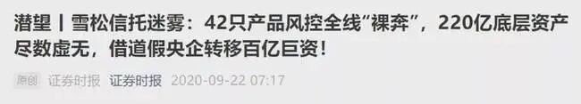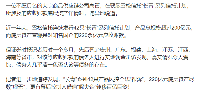 ▲截图/证券时报《潜望丨雪松信托迷雾:42只产品风控全线“裸奔”,220亿底层资产尽数虚无,借道假央企转移百亿巨资》