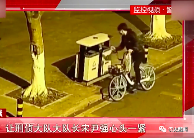 但是,可以看到他到了外面骑了一辆共享单车,他骑着这个共享单车在河边上溜达,可以看到他往河里扔东西的动作。
