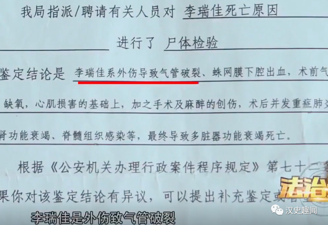 尸检报告显示,李瑞佳是外伤导致器官破裂,蛛网膜下腔出血,多功能器官衰竭死亡的。
