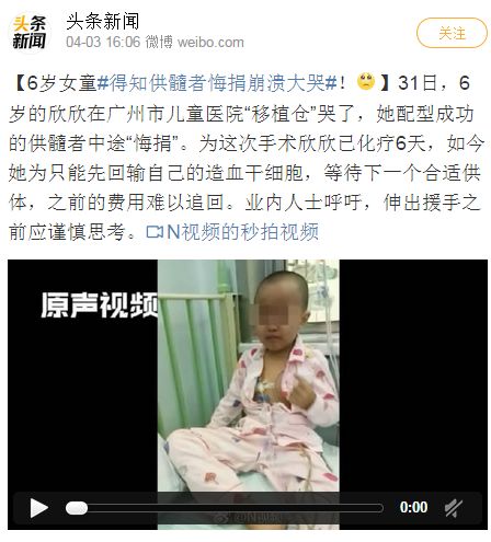3月31日,广州一位六岁的小女孩崩溃大哭,因为她急需骨髓移植,而与她配型成功的供髓者却中途“悔捐”。(具体信息见下图)